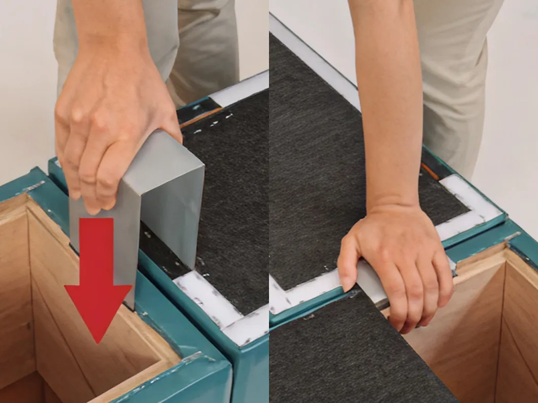 サイドガードの端の接合部分(コーナーガード)とサイドガードの土台部分(インセットレール)をビスで固定し、上からサイドガードをはめ込むタイプのキッズコーナーです。サイドガード全体がガッチリと接合するため、お子様がぶつかったり上で飛び跳ねてもズレる心配がありません。
