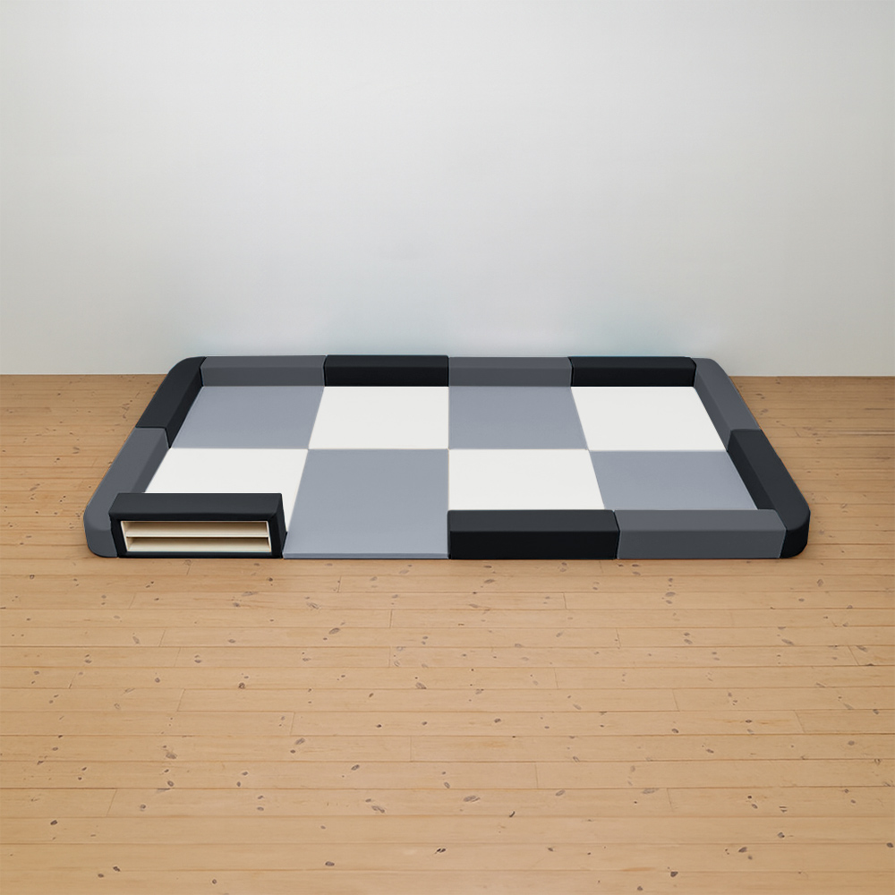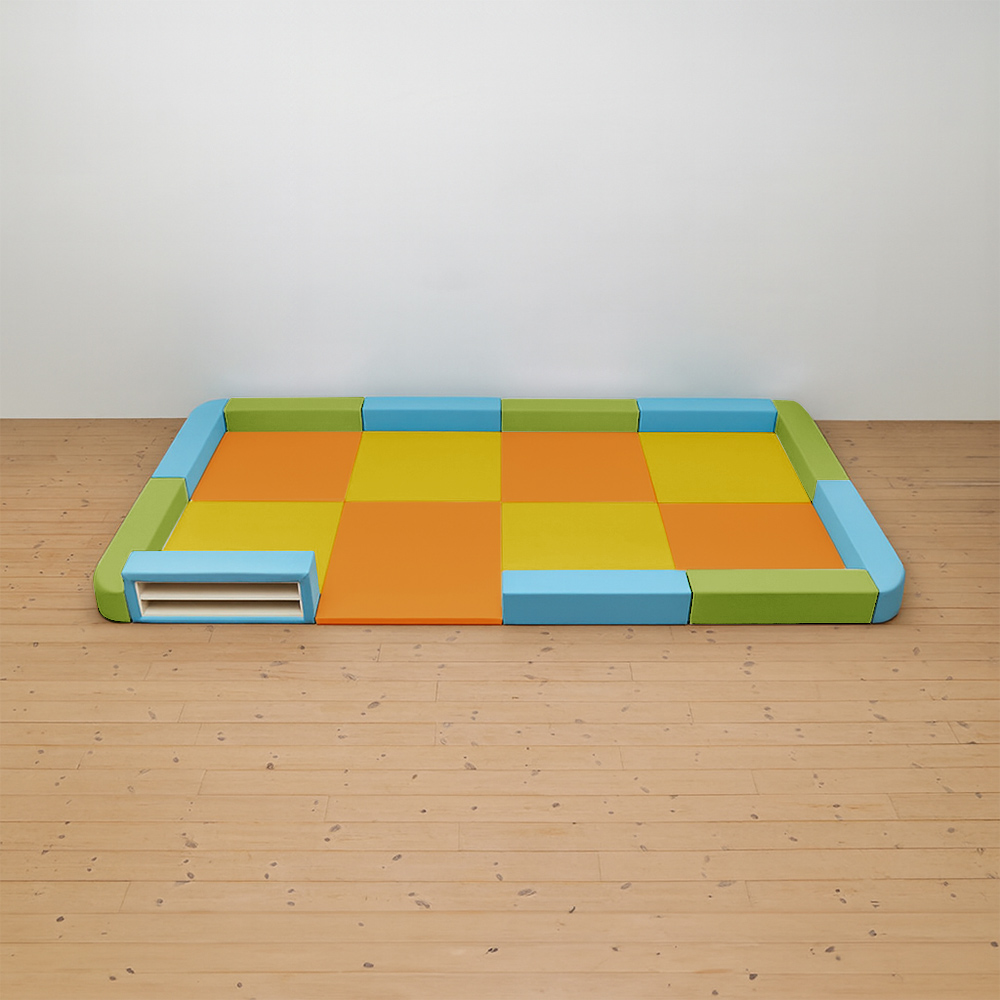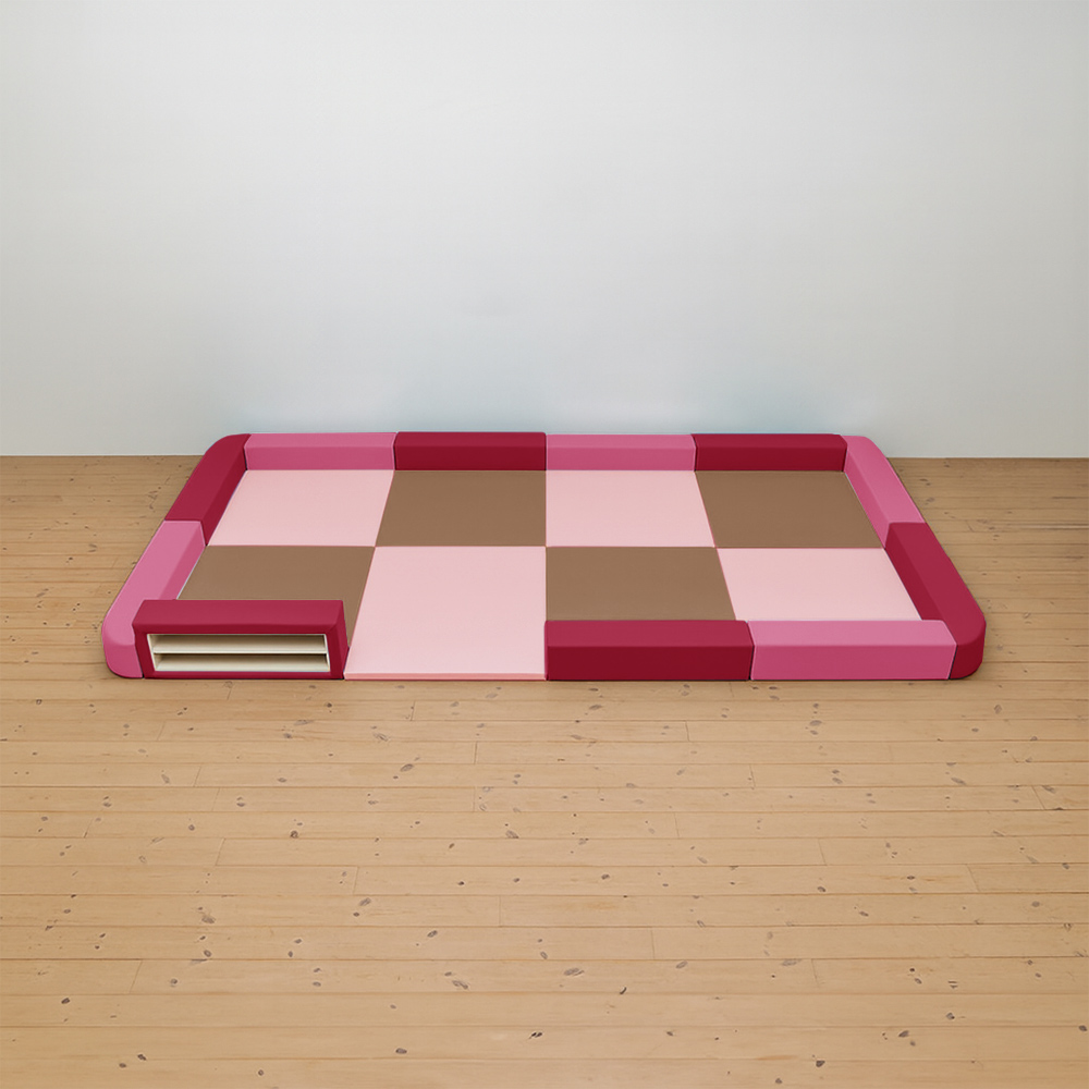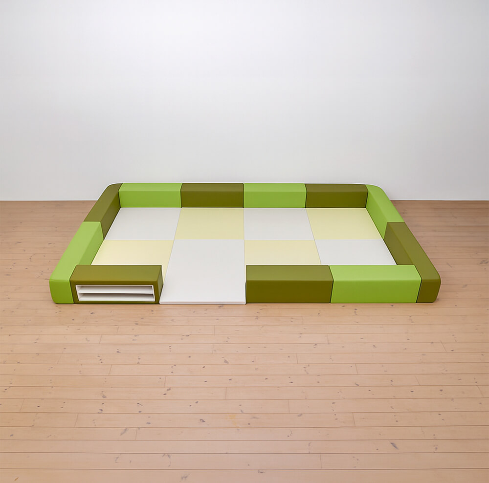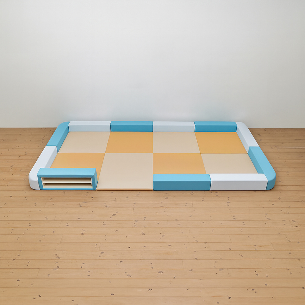 サイドガードの高さが300mm(バンビ)のベーシックシリーズのキッズコーナー4畳角Rセットの入り口・下駄箱付きになります。同タイプでノーマル、入り口付きのタイプもございます。