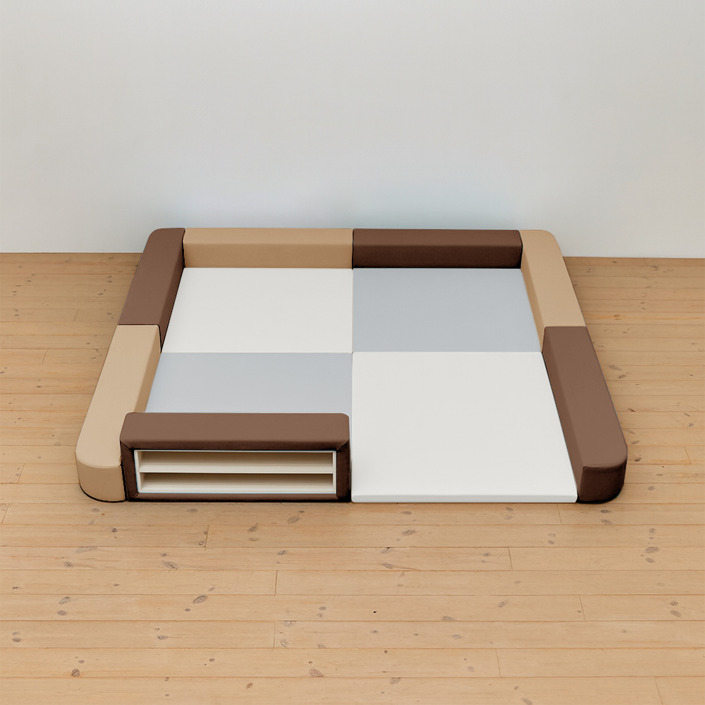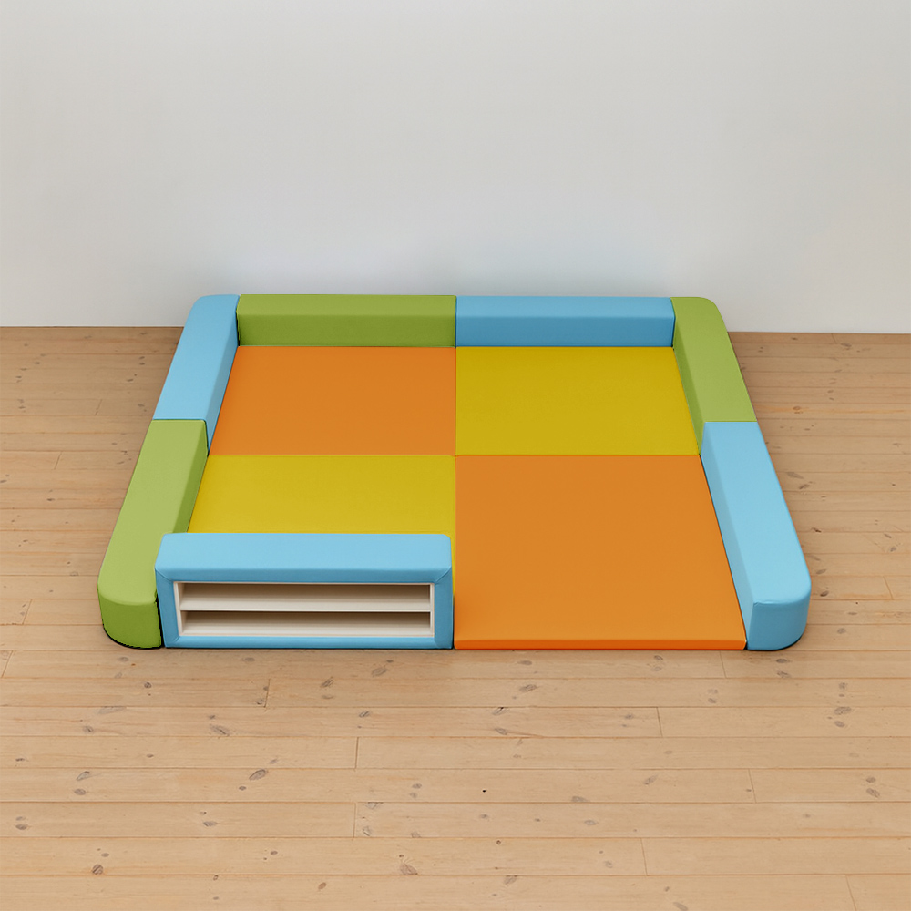 サイドガードの高さが300mm(バンビ)のベーシックシリーズのキッズコーナー2畳角Rセットの入り口・下駄箱付きになります。同タイプでノーマル、入り口付きのタイプもございます。